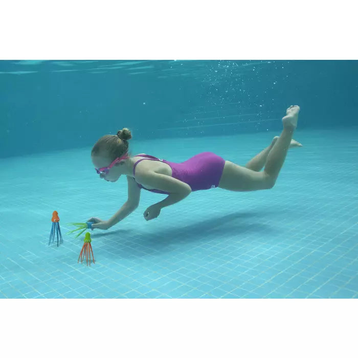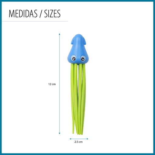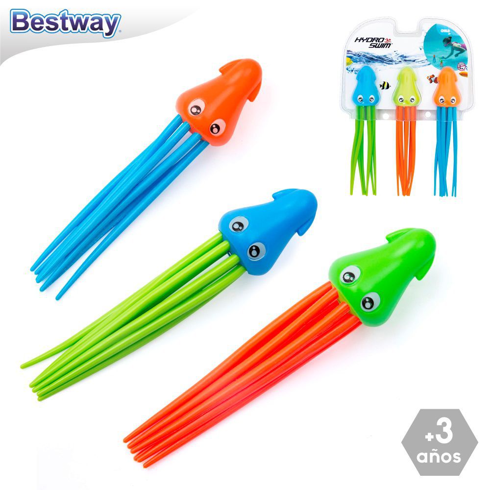 ¡Deja que los más pequeños aprendan con los juguetes y accesorios de piscina de Bestway ! Este pack de simpáticos calamares acuáticos, hará que los niños se diviertan en la piscina a la vez que mejoran su coordinación y aprenden a bucear. Tienen colores vibrantes y muy llamativos para que sean fácilmente reconocibles en el agua y están fabricados con materiales no tóxicos y muy resistentes. Además, estos divertidos calamares se pueden usar también en una bañera , para hacer más divertido ese momento del día. Características: - Fomenta la coordinación mano-ojo. - Edad: Niños +3 años. - Color: Verde, Naranja, Azul y Rojo. - Material: PVC de alta calidad. - Contenido: 3 juguetes acuáticos con forma de calamar.
