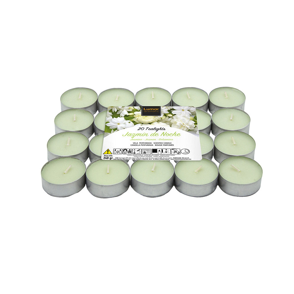 Set de 20 velas tealight con base de metal perfumadas con fragancia Jazmín de Noche.