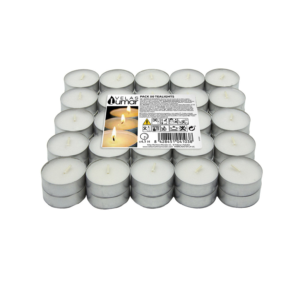 Velas pequeñas básicas sin perfume en recipiente de metal.
