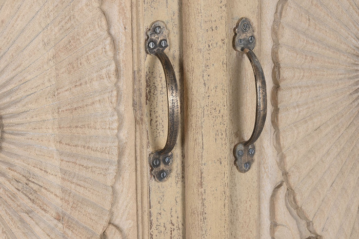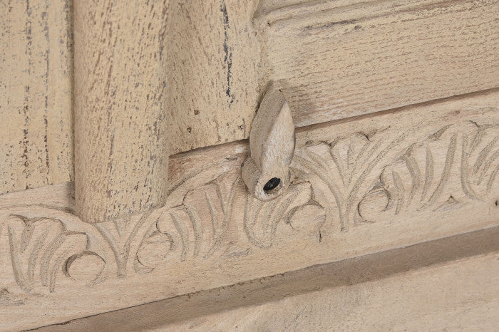 Armario de madera de mango acabado natural con diseño tallado artesanal. Una pieza robusta y decorativa que aporta calidez y carácter a cualquier estancia. Ideal para salón, dormitorio o recibidor gracias a su gran capacidad de almacenaje y su estética elegante de estilo natural / étnico.