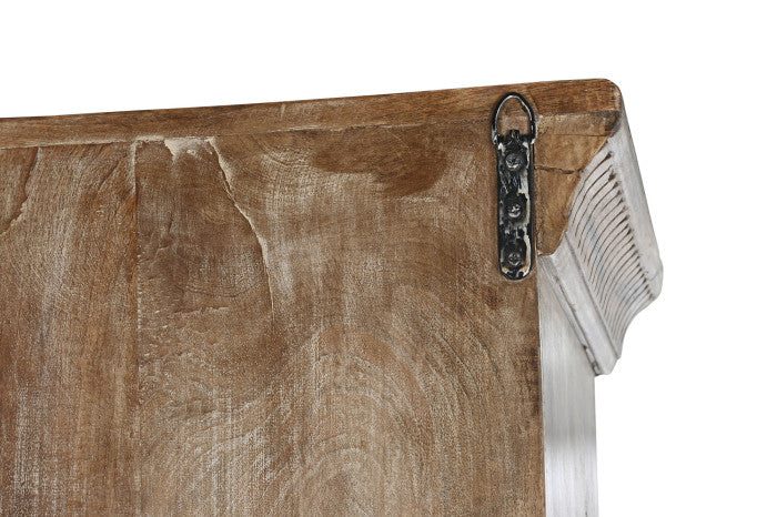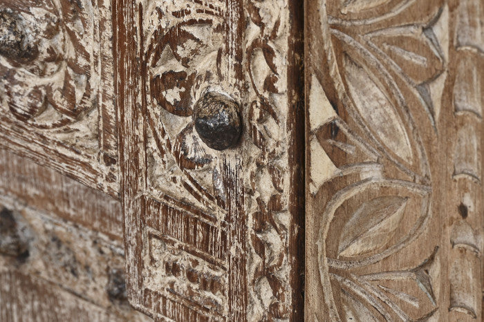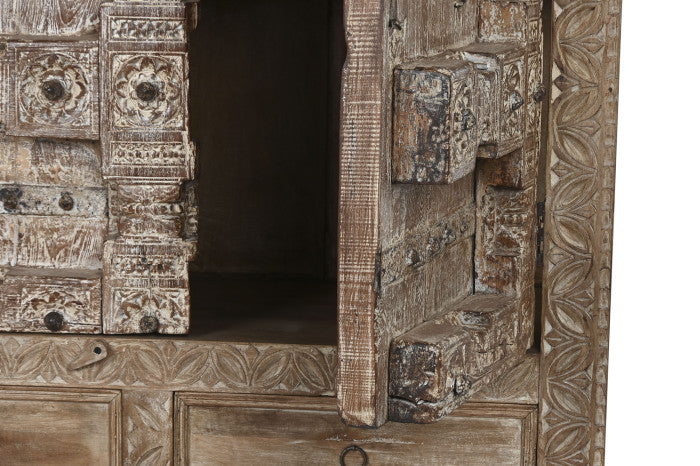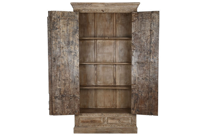 Armario fabricado en madera de teca natural, pieza única con carácter auténtico y acabado artesanal. Su diseño robusto y atemporal lo convierte en una opción ideal para aportar personalidad y calidez a cualquier estancia. Gracias a su combinación de puertas, estantes y cajones, ofrece una solución completa de almacenaje.