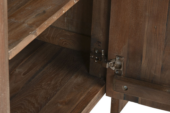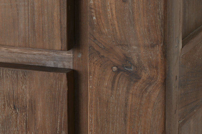 Armario fabricado en madera de teca reciclada con acabado natural, una pieza de estilo minimalista que combina sostenibilidad y diseño atemporal. Su estructura robusta y sus cuatro puertas ofrecen una amplia capacidad de almacenaje, ideal para salón, comedor o dormitorio.