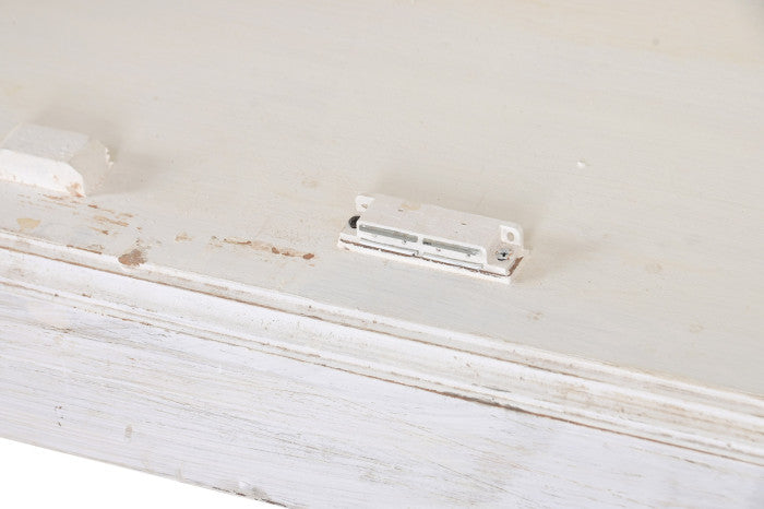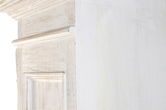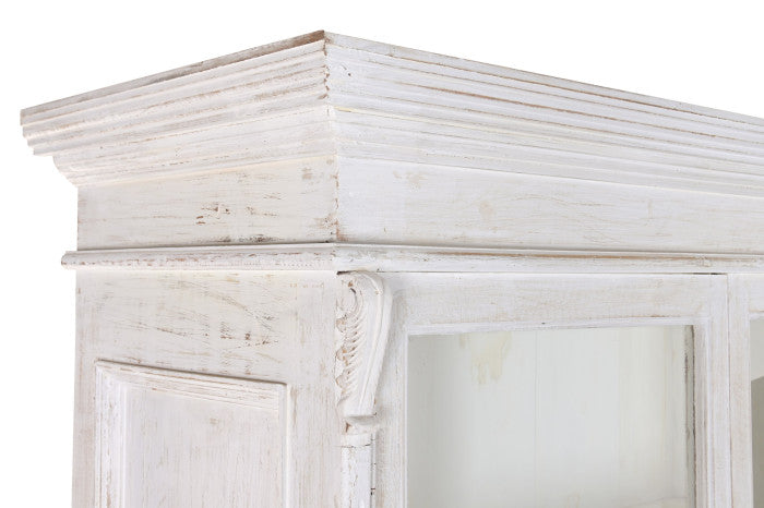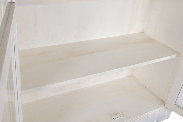 Vitrina de madera de mango en acabado decapé blanco, ideal para aportar luminosidad y estilo natural a cualquier estancia del hogar. Su diseño robusto y elegante la convierte en una pieza protagonista para salón, comedor o recibidor.